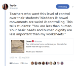Dont let your children be controlled like this. I remember back when I was in school my mom always told me “if you really need to use the bathroom or attend to an emergency and the teacher won’t let you, then just leave the classroom and I’ll deal with teacher and principle”