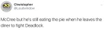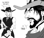 Gabriel, covered in soot and scorch marks, holding a furious McCree by his collar like some angry cat: DO YOU KNOW HOW HARD IT IS TO FIGHT 100 TEENAGERS ARMED WITH DYNAMITE